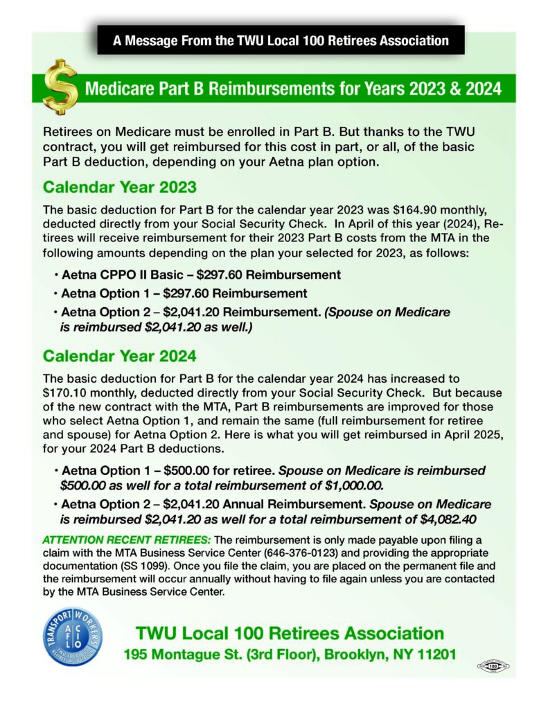 Retirees in Medicare Part B are entitled to reimbursements, in part, or all, of their Part B basic deductions depending on their Aetna medical plan.