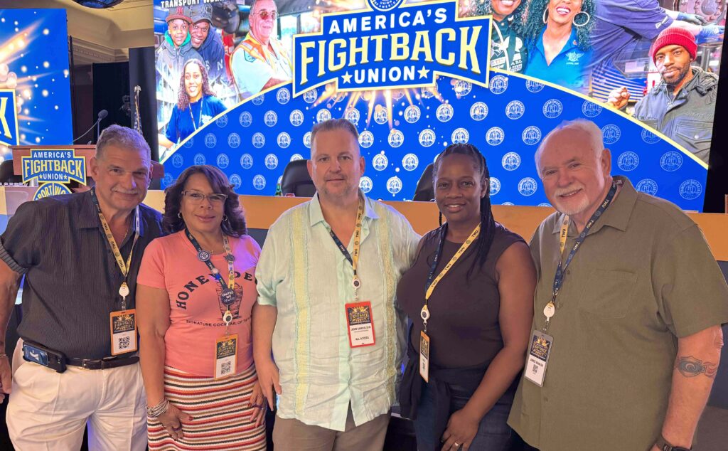 Above photo was taken at the TWU Convention on Sept. 18, 2025. From the left, Retirees Executive Board member Dominic Spagnolo, Alternate Board Member Theresa Green, TWU International President John Samuelsen, Retirees Staff Director Shalena Lindsey, and Retirees Association Director and International Vice President James Whalen.